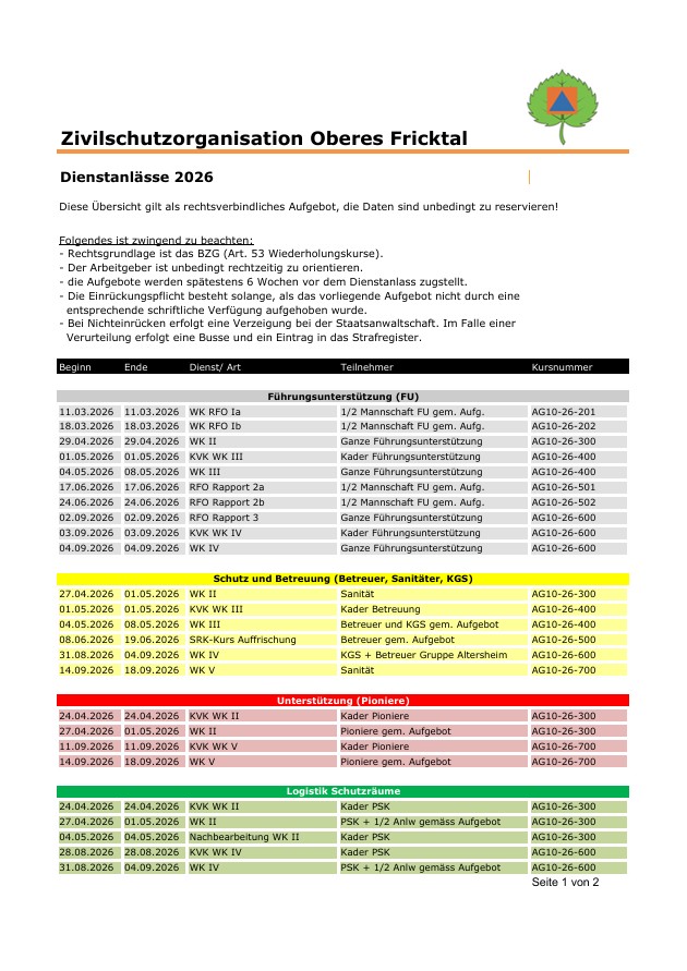 Nachstehend finden Sie den Dienstleistungsplan der ZSO Oberes Fricktal für das Jahr 2026.